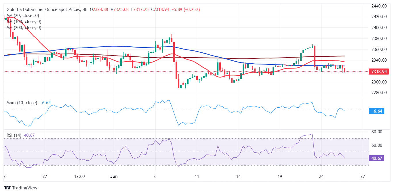 XAU/USD trades around $2,320, and the daily chart suggests it may maintain the downward bias. The pair is finding sellers around a flat 20 Simple Moving Average (SMA) for a second consecutive day while still holding above bullish 100 and 200 SMAs. However, technical indicators gain bearish momentum within negative levels, in line with an extended slide, particularly on a break below $2,306.45, the immediate support level.