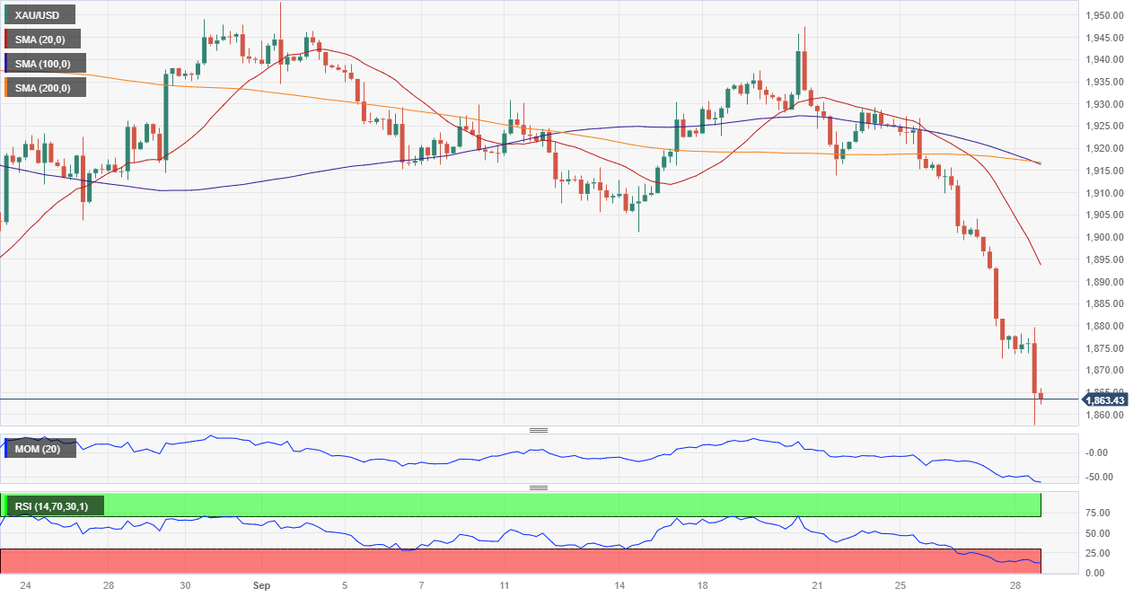 From a technical perspective, the daily chart shows XAU/USD is sharply down for a fourth consecutive day, with no signs of downward exhaustion. Technical indicators maintain their bearish slopes, with the Relative Strength Index (RSI) indicator heading south at around 27. At the same time, XAU/USD develops over $50.00 below a bearish 20 Simple Moving Average, which accelerates its slide below the longer ones.