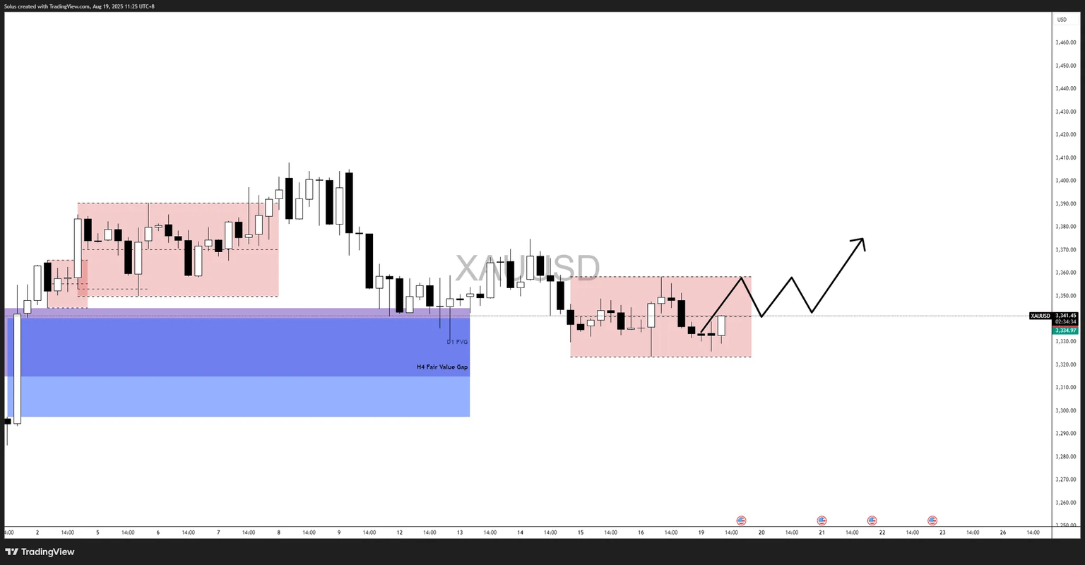 For the gold price forecast, the outlook is simple: a clean close above $3,400 confirms continuation, opening targets toward $3,420–$3,440 and potentially $3,480. If price slips back into the FVG, a retest of $3,335–$3,320 becomes likely before bulls can attempt another run.