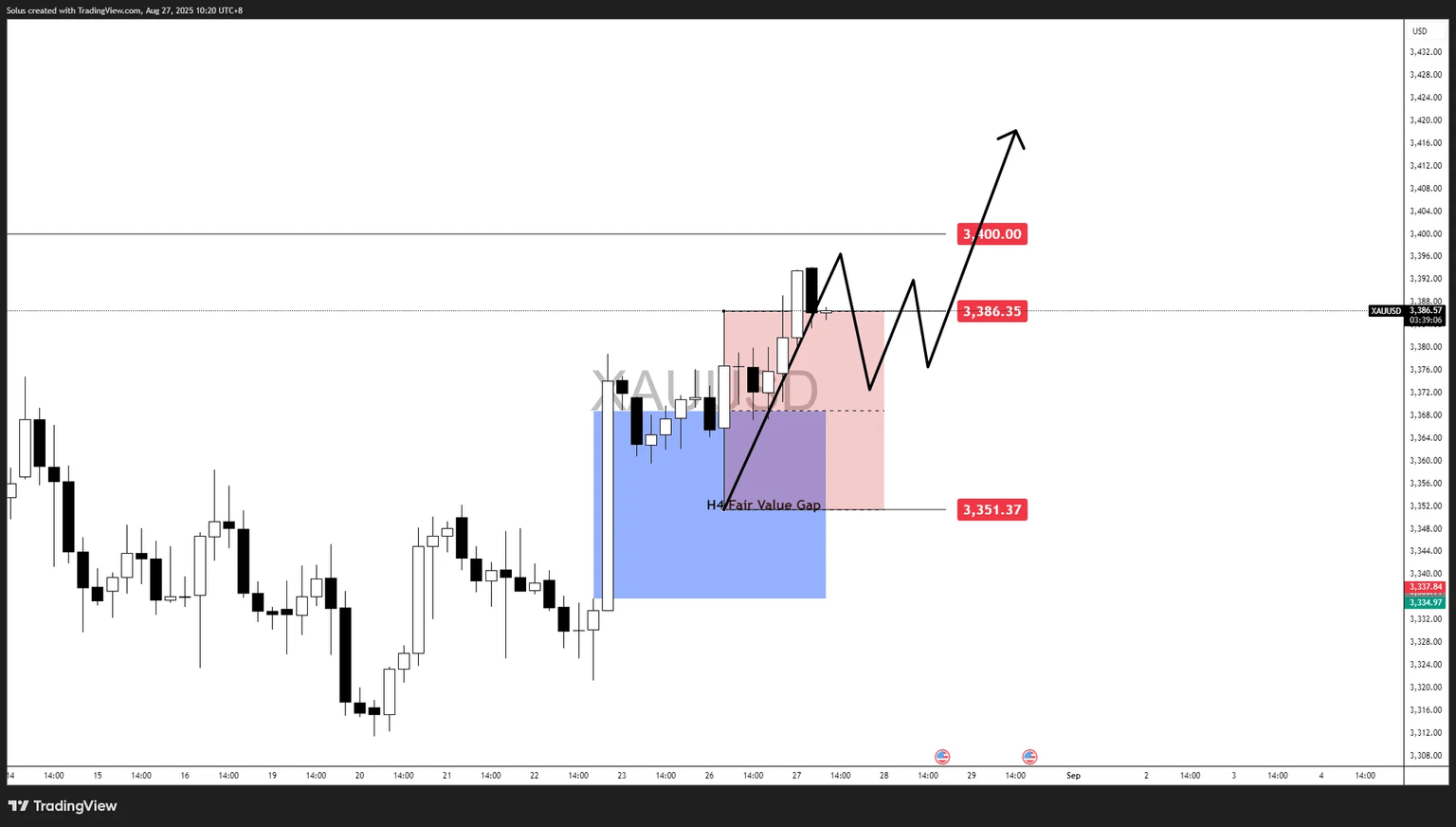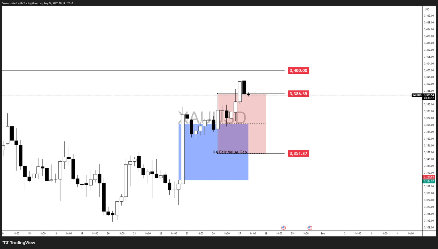 Gold’s breakout has materialized, with XAU/USD pushing from the $3,335 base into the $3,386 area, just below the key $3,400 level. The rally left behind a 4H Fair Value Gap (FVG) at $3,351–$3,366, which now acts as the main support zone for this bullish leg.
