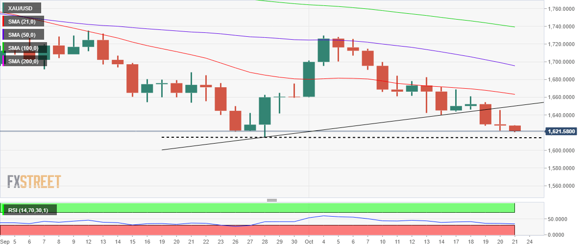 Gold price is licking its wounds while trading close to three-week lows near $1,620 on the final trading day of the week, heading for the second consecutive weekly decline. The bright metal continues to feel the heat of the multi-year highs reached in the US Treasury yields across the curve amid prospects of aggressive Fed rate hikes and an inevitable global recession. The recent strength in the yields is underpinning the sentiment around the US dollar, offering a double-whammy to the USD-priced gold price. Markets remain in a cautious mood, with the US corporate earnings season underway and renewed political chaos in the UK, which will leave the country with the fifth Prime Minister in six years. Further, China’s covid and economic concerns continue to keep investors on tenterhook, especially after its twice-a-decade party congress. Amid a risk-averse market environment, investors seek safety in the dollar at the expense of the bullion.