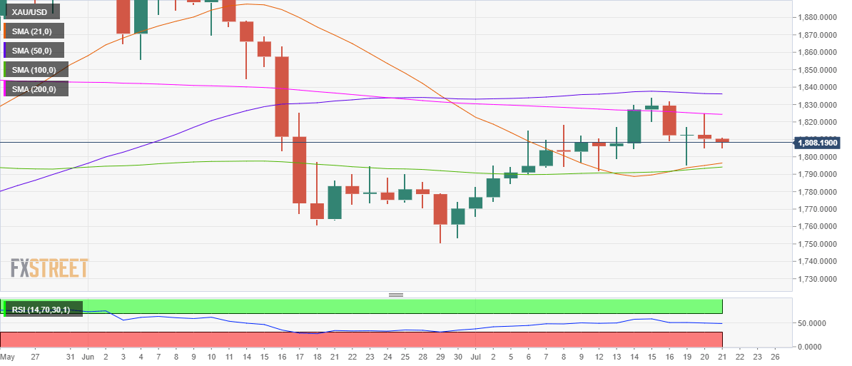 Gold price once again witnessed good two-way businesses on Tuesday, initially rallying as high as $1825 before reversing sharply to settle around $1810. The 10-year US Treasury slid to the lowest levels in five-month lows on global economic growth concerns, in light of the rapid spread of the Delta covid variant. In early American trading, gold price saw a sharp downtick after facing rejection at the critical 200-Daily Moving Average (DMA) at $1825. The rebound in the US yields drove the greenback higher amid stimulus optimism while the risk sentiment improved on Wall Street after the world’s richest man, Jeff Bezos successfully completed a short trip to space. However, the retreat in the dollar amid risk-on flows helped gold price recover ground towards the closing.