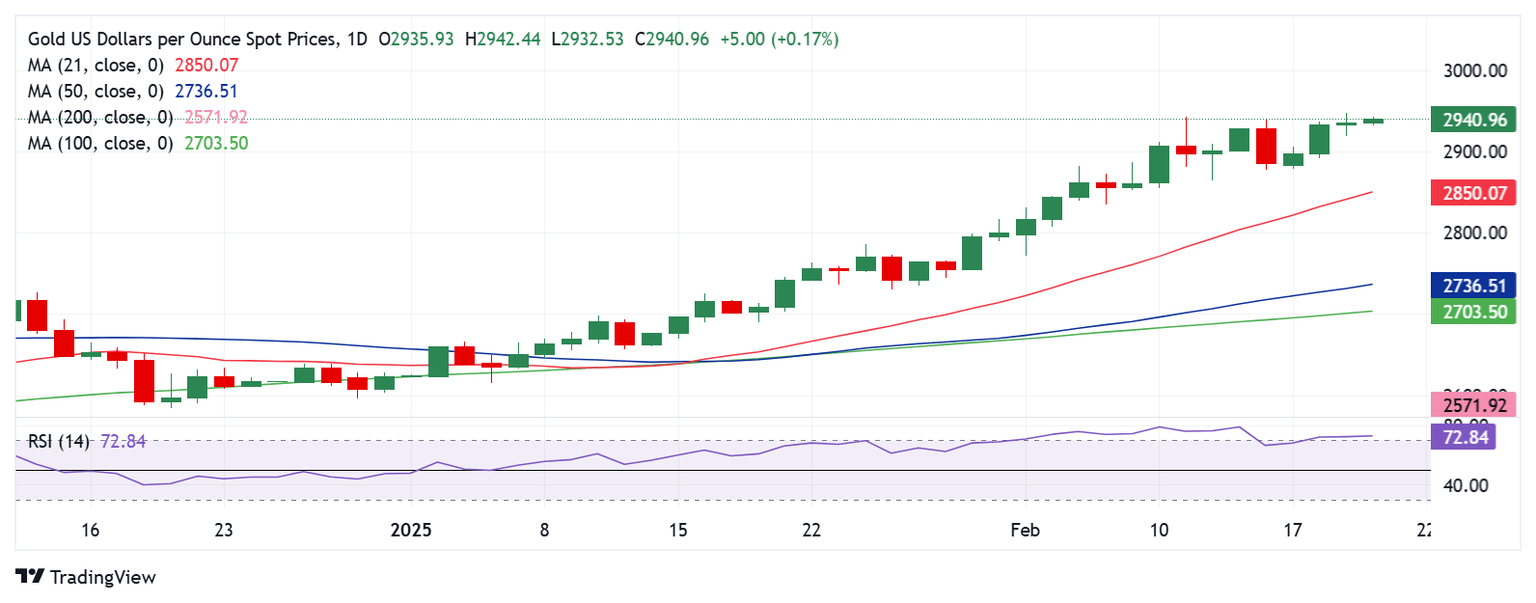 The daily chart shows that Gold price hangs near the record high of $2,947. The 14-day Relative Strength Index (RSI) flatlines in the overbought territory, currently near 73, suggesting that there is some room to the upside before a correction kicks in.
