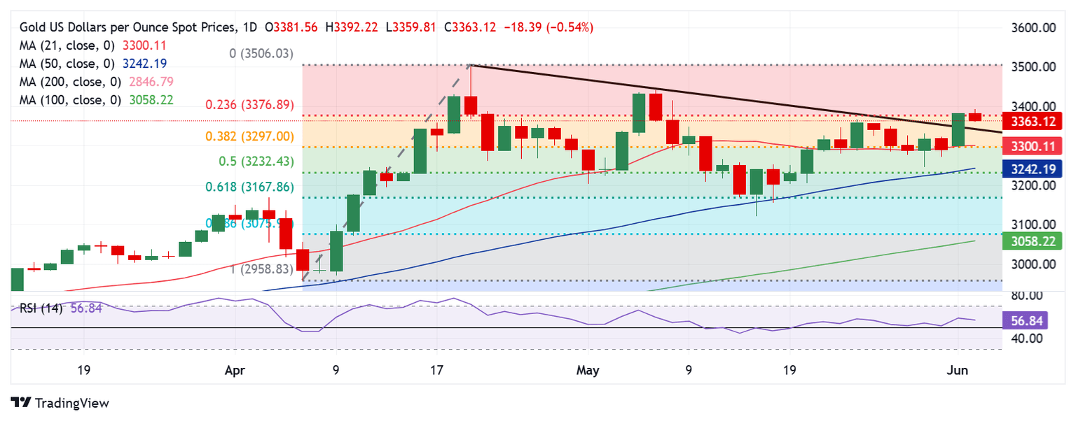 At the moment, Gold price is struggling yet again with $3,377, the 23.6% Fibonacci Retracement (Fibo) level of the April record rally.