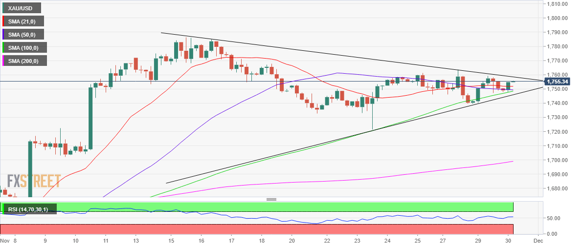 Gold price is on the verge of yielding a symmetrical triangle breakout on the four-hour chart. The bright metal needs a four-hour candle stick close above the falling trendline resistance at $1,759 to confirm the upside break. If Federal Reserve Chair Jerome Powell backs the dovish pivot, Gold bulls could see the much-needed boost.