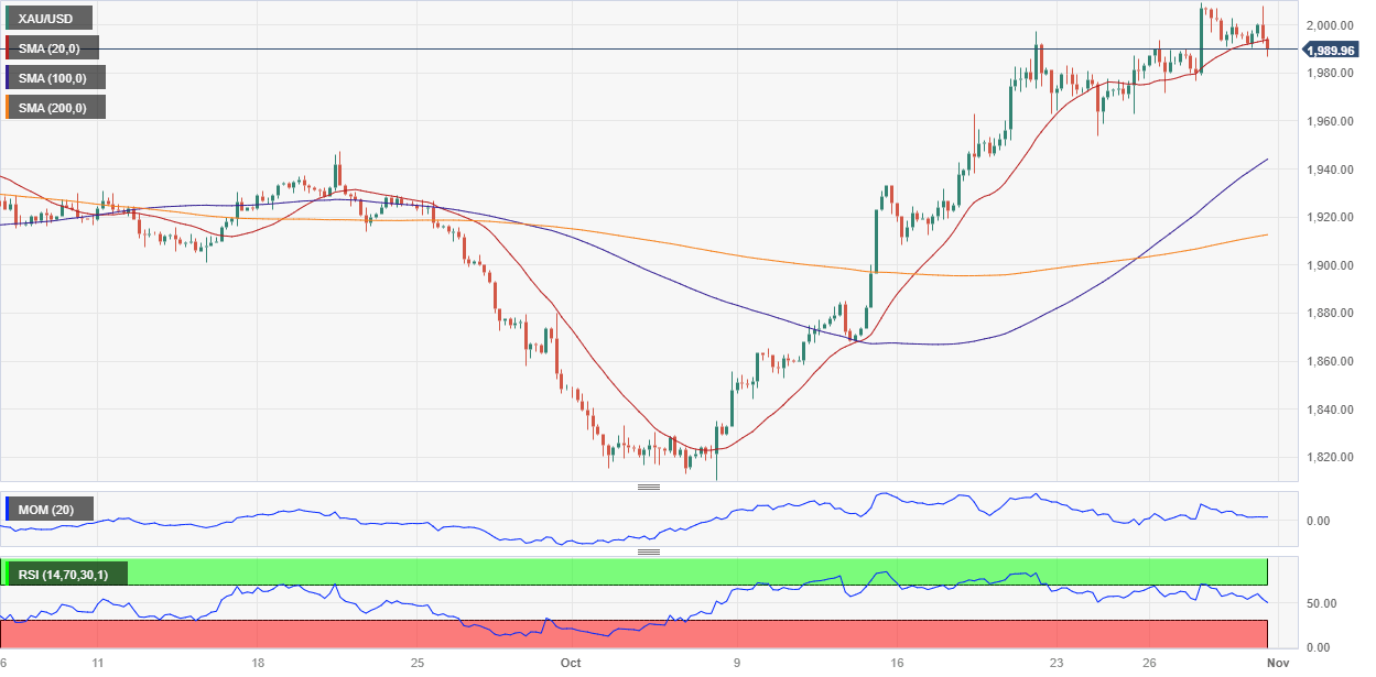 Spot gold surged throughout the first half of the day but turned south in the American session, following dismal United States (US data) spurring US Dollar demand. XAU/USD peaked at $2,007.91 a troy ounce as financial markets remained optimistic during European trading hours, aided by softer-than-anticipated Euro Zone inflation figures. The EU also reported tepid growth in the third quarter of the year, as the annualized reading of the Q3 Gross Domestic Product (GDP) printed at 0.1%.