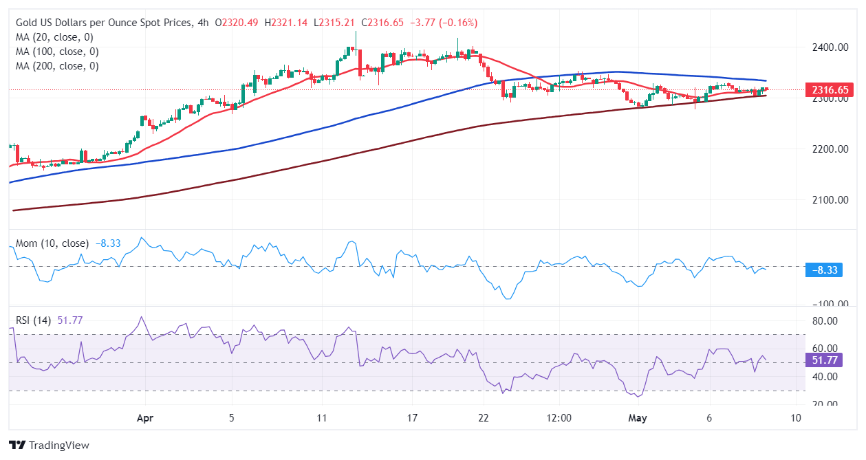 Gold price flirts with $2,320 in the American session, trimming early losses that sent XAU/USD to a weekly low at $2,303.60. The US Dollar lost momentum after Wall Street's opening despite the poor performance of American indexes. The Dow Jones Industrial Average (DJIA) posts some modest gains, although the Nasdaq Composite and the S&P 500 trade in the red.