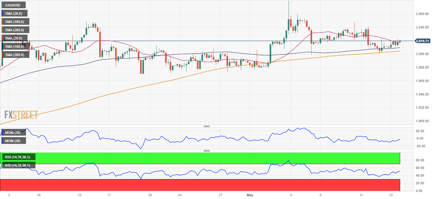 Spot gold trades with modest gains at around $2,020 a troy ounce in a slow start to the week. XAU/USD advances amid easing US Dollar demand amid a better market mood. Nevertheless, caution persists as United States authorities extend debt ceiling-related negotiations. As the macroeconomic calendar remained light, speculative interest focuses on a potential US default. President Joe Biden announced he would meet with lawmakers on Tuesday in an attempt to reach a deal.