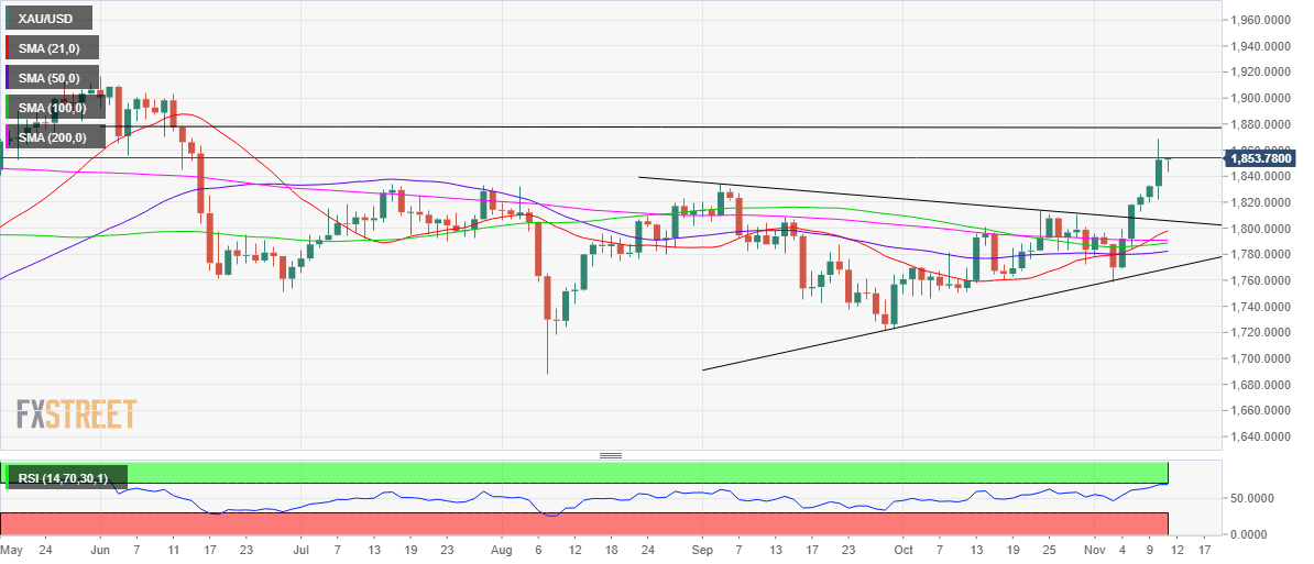 Will US inflation trigger a sustained move above $1,834 in XAU/USD? This was a rhetorical question to which the response was aptly provided after the US Consumer Price Index (CPI) jumped to the highest level in 31 years in October, arriving at 6.2% YoY. The multi-decade rise in the US inflation fuelled a massive rally in gold price, busting the critical $1,834 resistance. Gold price surged to the highest levels since June 16 at $1,869 before pulling back sharply to settle at $1,853.