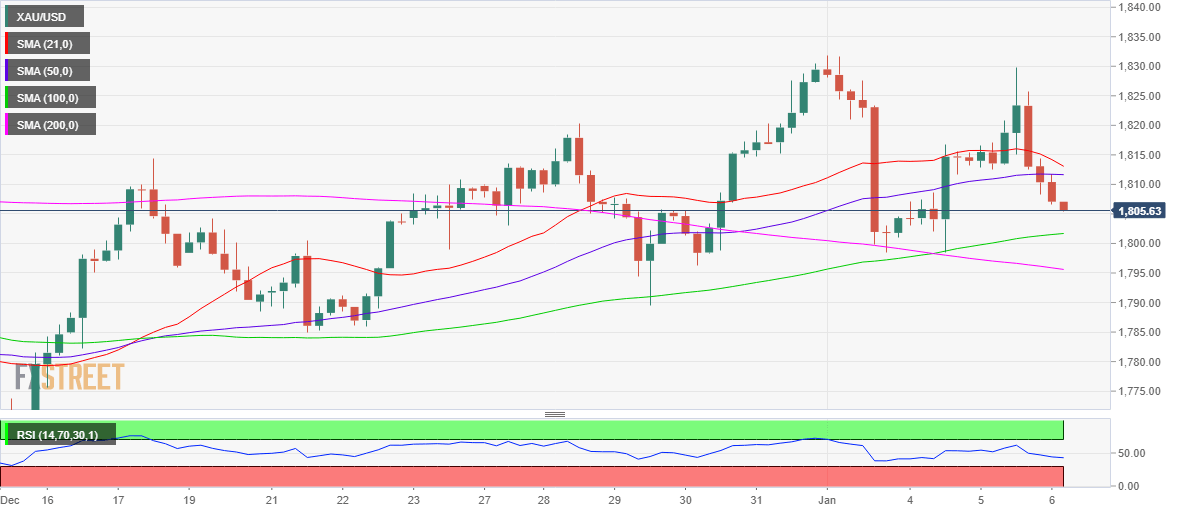 Gold’s 4-hour chart paints a bearish picture in the near term. Having breached the 50-Simple Moving Average (SMA) at $1,812 in the overnight trades, gold bears are now targeting the upward-sloping 100-SMA at $1,802.