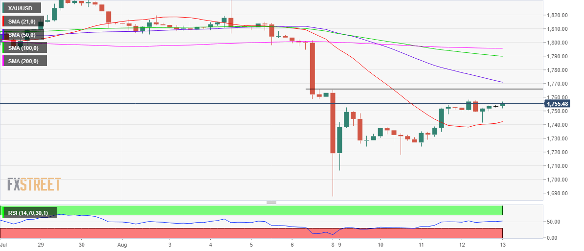On the final trading day of the week, the greenback is tracking the weakness in the US rates, as the ongoing spread of the Delta covid variant and Chinese regulatory curbs dent the appetite for higher-yielding assets. Therefore, gold price has regained the bullish momentum, although the bulls remain cautious ahead of the US Preliminary Michigan Consumer Sentiment data, which is seen steady at 81.2 in August. A downside surprise on the US sentiment gauge could weigh on the Fed’s tapering expectations, bossing well for gold price. Meanwhile, a broader market consensus that the Fed will unveil its tapering plan next month also keeps gold price in a familiar range above $1750 ahead of the key event risk this Friday.
