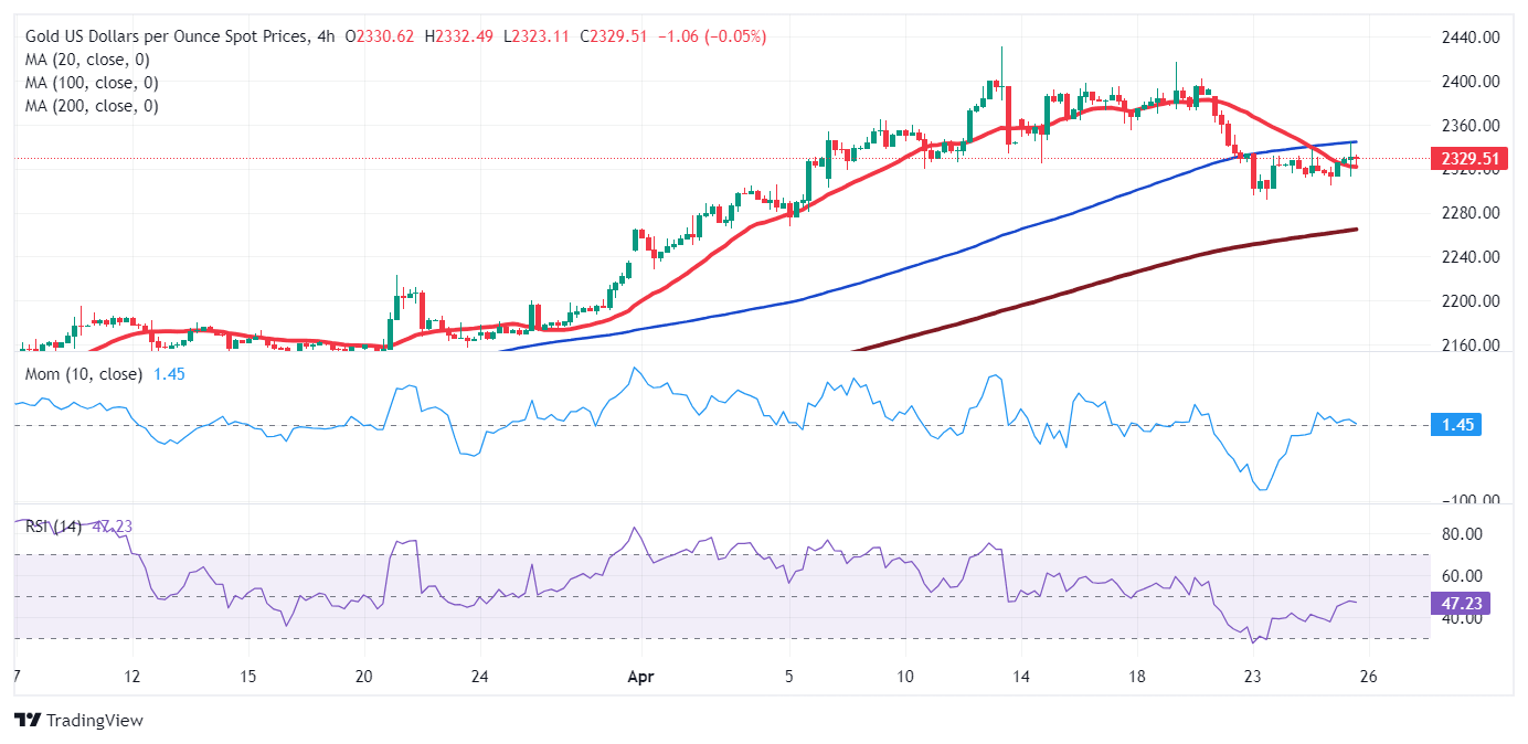 Generally speaking, Gold tends to benefit against the USD in a risk-averse environment, which skews the risk to the upside. In the near term, and according to the 4-hour chart, XAU/USD offers a neutral-to-bullish stance. The Momentum indicator is losing its upward strength but holds above its 100 line, while the RSI indicator consolidates around 47, reflecting the absence of apparent directional strength. At the same time, a mildly bullish 100 SMA provides dynamic resistance at around $2,343.50, while the 20 SMA aims lower below the current level.