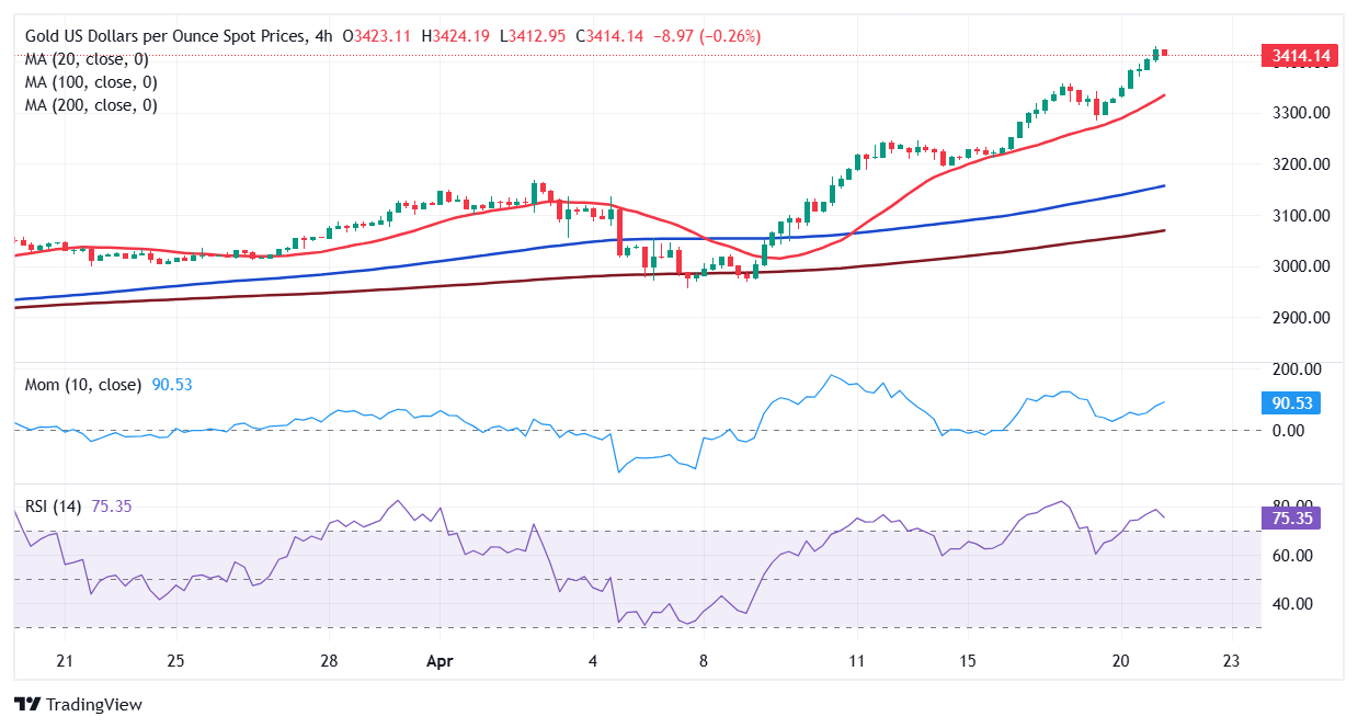 Spot Gold traded as high as $3,430.36 on Monday, rallying on continued US Dollar (USD) weakness. Market players keep losing confidence in the Greenback amid United States (US) President Donald Trump's decisions.