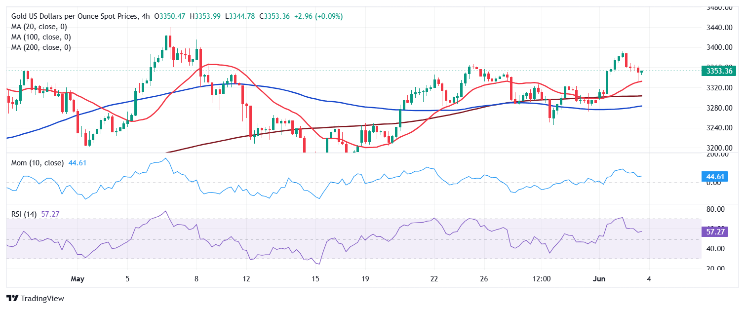 From a technical point of view, XAU/USD seems to be consolidating gains and with the risk still poised to the upside. In the daily chart, the bright metal holds above all its moving averages, with a flat 20 Simple Moving Average (SMA) offering support around $3,292.80, while the 100 and 200 SMAs keep grinding north far below the shorter one. Technical indicators, in the meantime, remain within positive levels, although with uneven directional strength.
