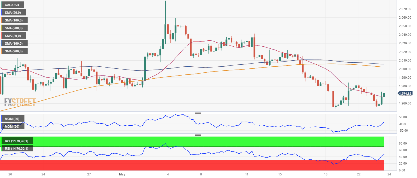 In the near term, and according to the 4-hour chart, XAU/USD offers a neutral stance. The pair is just above the 20 SMA, which losses its bearish strength but far below the longer one. At the same time, technical indicators stand pat around their midlines, reflecting the absence of clear directional strength. Bulls could regain control if the pair breaks above $1,984.16, May 19 daily high.
