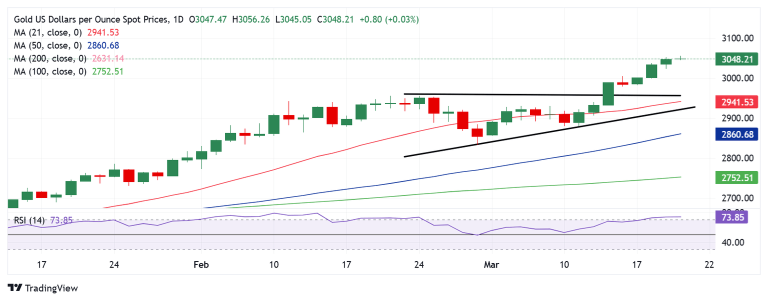 - Gold price eyes triangle target at $3,080 but overbought conditions warrant caution.