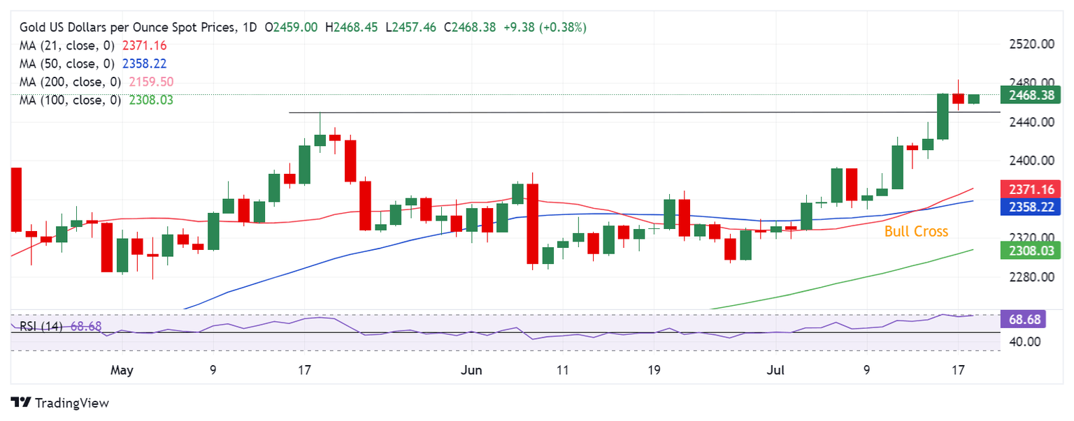 Gold price remains poised to capture the $2,500 level if the record high at $2,484 is taken out convincingly. The next resistance level is seen at the $2,550 psychological mark.