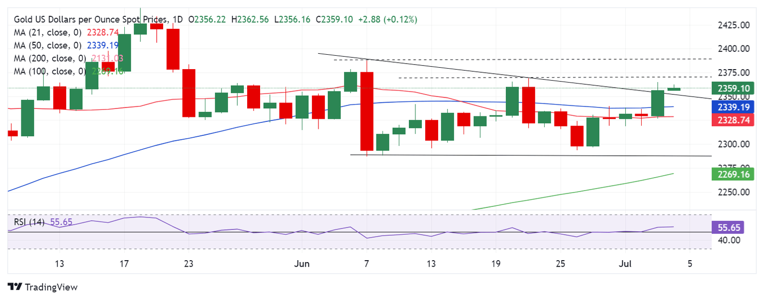 Gold price is looking to extend the previous upsurge early Thursday, sitting at the highest level in over a week near $2,360. Sustained US Dollar (USD) weakness alongside sluggish US Treasury bond yields underpin Gold price amid the July 4 US holiday-thinned market conditions.