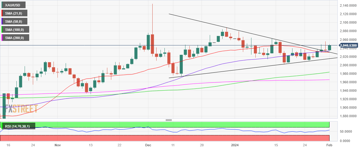 As observed on the daily chart, Gold price confirmed an upside break from a month-long symmetrical triangle formation after closing convincingly above the falling trendline resistance at $2,036 on Wednesday.