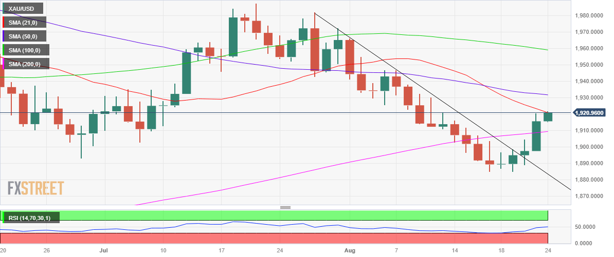Gold price is extending the recovery from five-month lows into the fourth day in a row this Thursday, flirting with two-week highs near $1,920. The United States Dollar (USD) is licking its wounds alongside the US Treasury bond yields, providing a fresh lift to the Gold price, as traders position for a fresh batch of top-tier US economic data and the US Federal Reserve’s (Fed) three-day annual Economic Symposium at Jackson Hole, Wyoming.