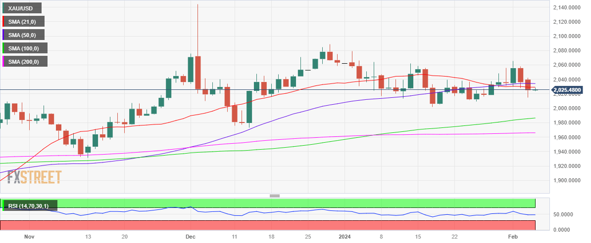 As observed on the daily chart, Gold price closed Monday below the critical support in the $2,030-$2,035 region. That level is the confluence of the 21-day and 50-day Simple Moving Averages (SMA).