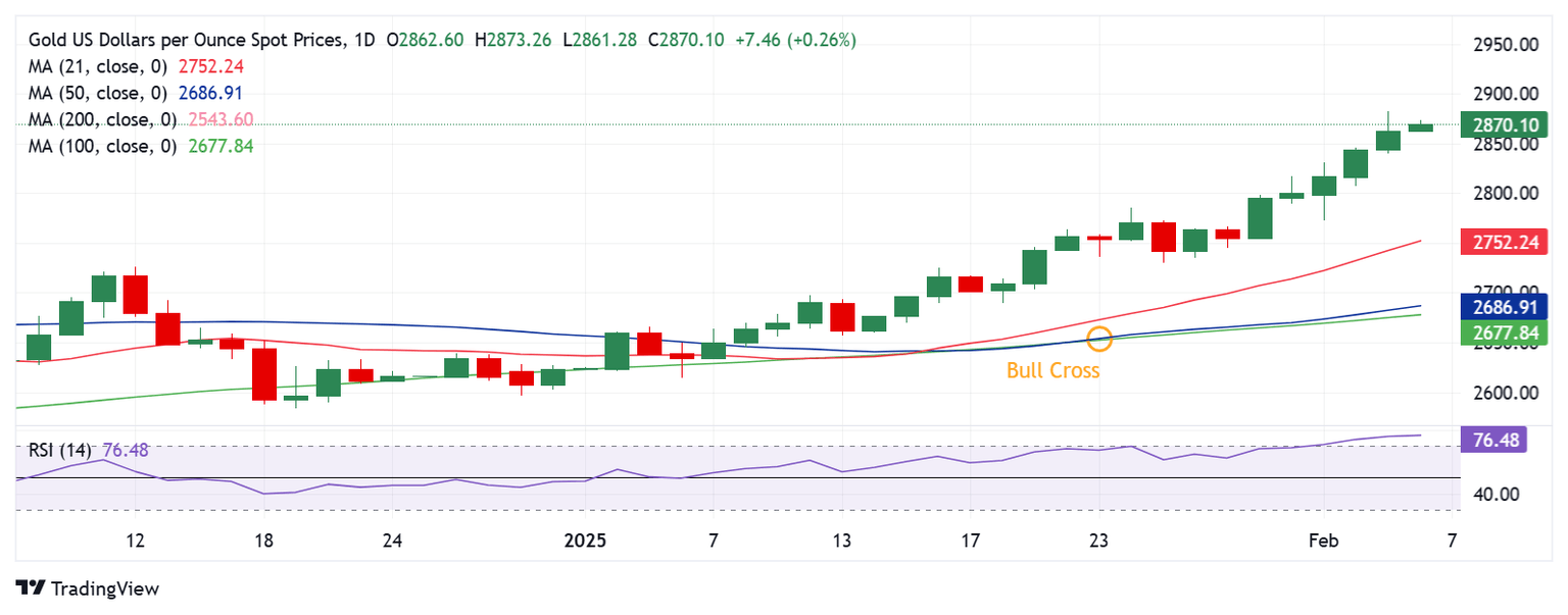 Gold price extends its winning streak into a sixth straight day on Thursday, consolidating near record highs of $2,882 set on Wednesday.