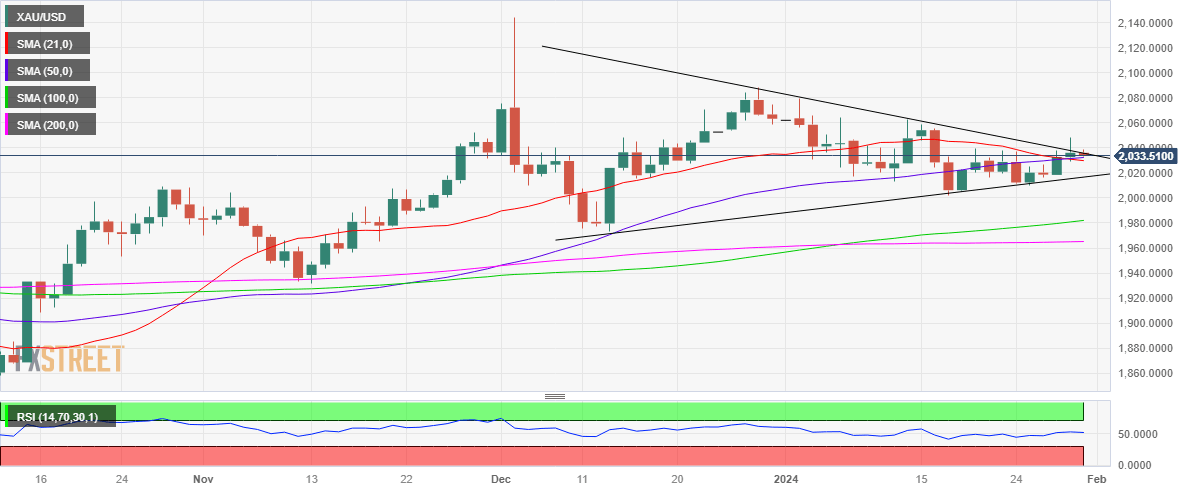 On the downside, an immediate cushion is seen around the $2,030 region, where the 21- and 50-day SMAs hang around. If the latter gives way, Gold sellers will test the rising trendline support of $2,017 on their way to the key $2,000 threshold.