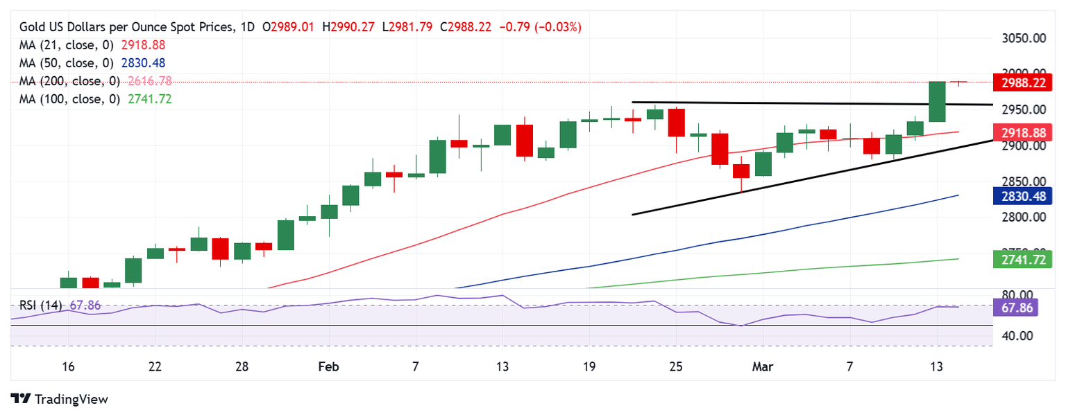 Gold price is hanging close to a new record high set on Thursday, biding time before the next move higher to clinch the $3,000 threshold for the first time.