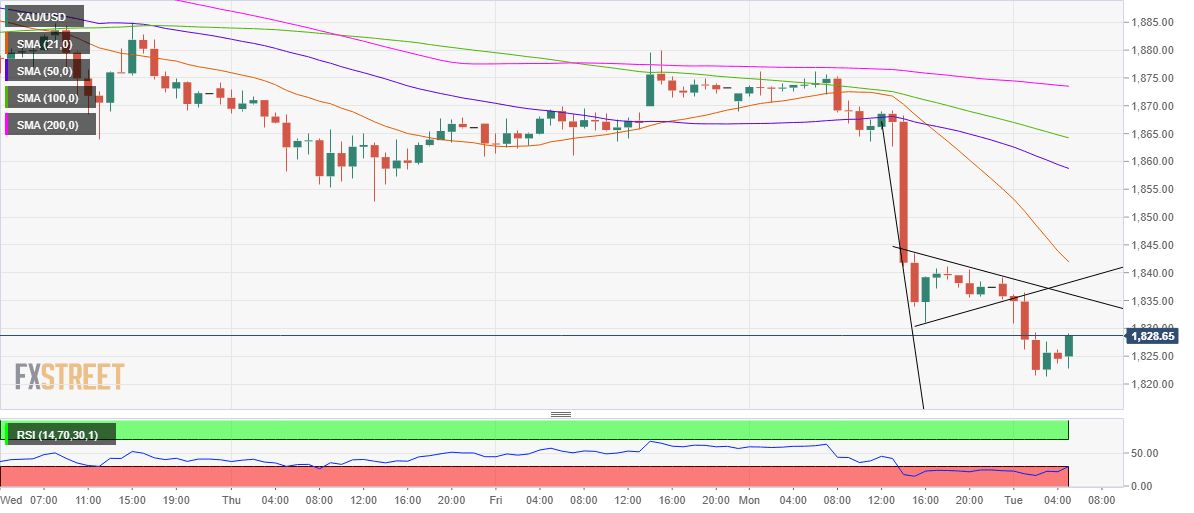 The next resistance is seen at the bearish 21-hourly moving average (HMA) at $1842. The long-held support at $1850 could then act as a strong resistance if the bulls extend the recovery momentum.