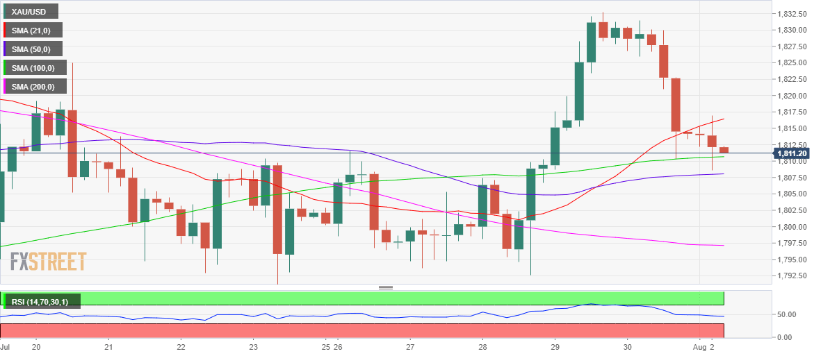 Gold price has bounced off the horizontal 50-Simple Moving Average (SMA) at $1808 on the four-hour chart earlier on.