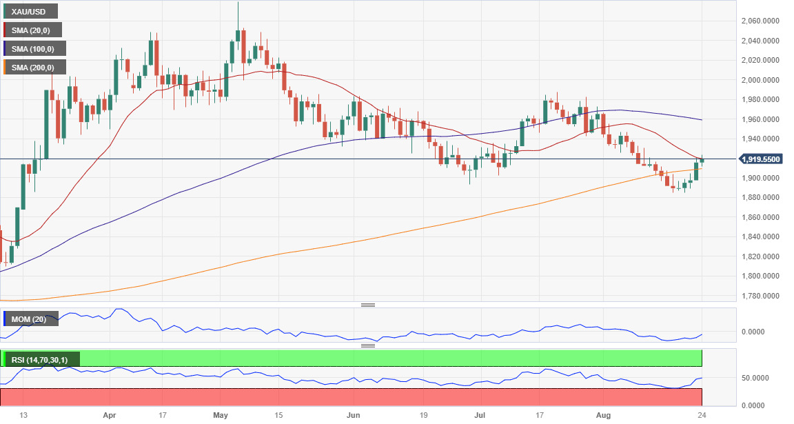 XAU/USD trades in the green for a fourth consecutive day, but the bullish potential seems limited. The pair is meeting sellers around the 38.2% Fibonacci retracement of the $1,982.12/$1,884.77 slide at $1,921.80. The daily chart shows that Gold is battling to overcome a bearish 20 Simple Moving Average (SMA), which remains far below the 100 SMA. The 200 SMA, in the meantime, converges with the 23.6% retracement at 1,907.30, reinforcing the support level. Finally, technical indicators have turned flat right below their midlines, reflecting decreased buying interest.