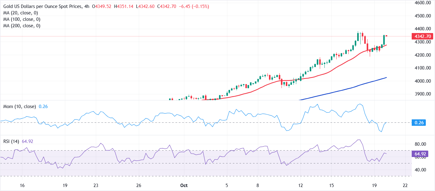 Spot Gold trades near its all-time high of $4,379.76 a troy ounce, up on a daily basis on Monday. The positive tone of global equities limits XAU/USD's near-term bullish potential, but underlying political and trade woes keep the bright metal afloat.