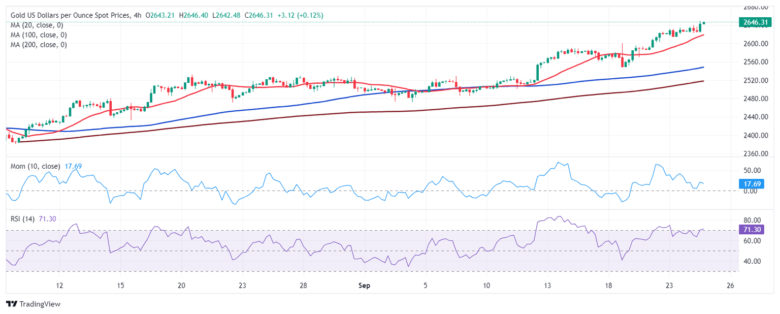 XAU/USD trades around $2,645 with no signs of giving up. In the daily chart, the pair keeps posting higher highs and higher lows, while technical indicators maintain modest bullish slopes within overbought levels. At the same time, the pair develops far above bullish moving averages, with the 20 Simple Moving Average (SMA) now hovering at around $2,545.