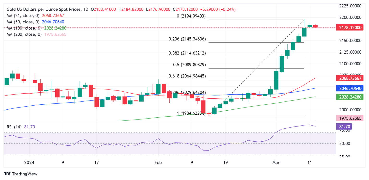 The next cushion is seen at $2,145, where the March 7 low and the 23.6% Fibonacci Retracement (Fibo) level of the recent rally from the February 14 low of $1,984 to the all-time high of $2,195 coincide.