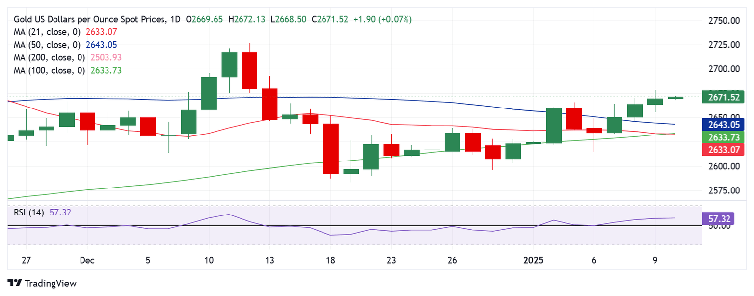 The daily chart shows that the 14-day Relative Strength Index (RSI) holds comfortably above the midline, currently near 57.50, justifying the ongoing upside in Gold price. Additionally, Gold price closed Tuesday above the static resistance at $2,665.