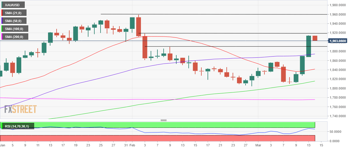 On the flip side, the $1,900 round number could be tested on further retracement in the Gold price. Should the correction gather steam, then Gold sellers will extend control toward the mildly bullish 50-Daily Moving Average (DMA) at $1,874.