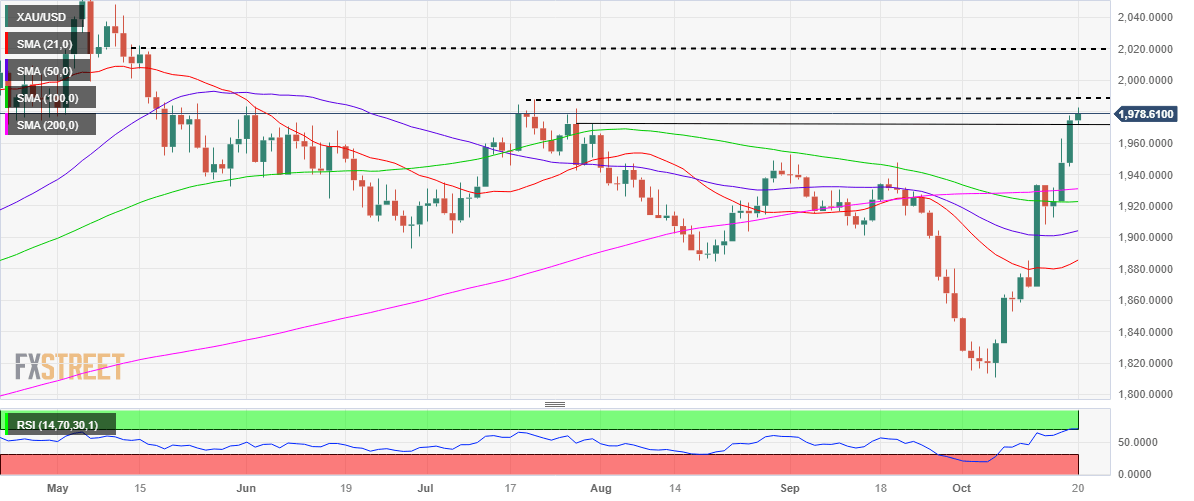 Gold price is sitting at the highest level since July near $1,980, sustaining its ongoing bullish momentum early Friday. Gold price continues to capitalize on escalating geopolitical tensions between Gaza and Israel, shrugging off the relentless upsurge in the US Treasury bond yields.