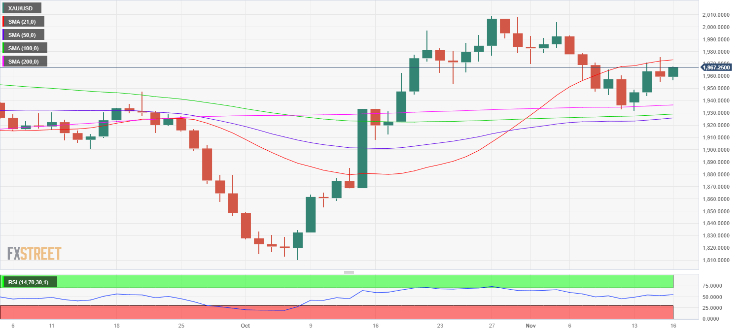 Daily closing above the 21-day SMA at $1,975 is needed for a sustained upside toward the November 6 high of $1,993, above which the $2,000 mark will be retested.