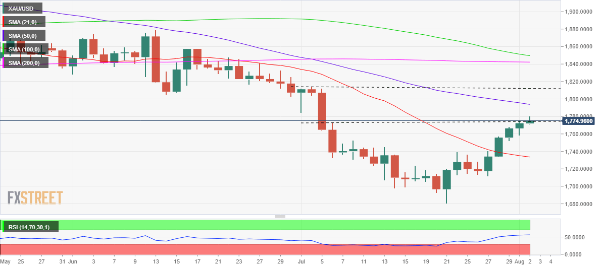 Gold price is extending its winning streak into a fifth trading day on Tuesday, having hit the highest level in four months near $1,780. Gold bulls are rejoicing the reducing bets for a 75 bps Fed rate hike in September amid a combination of factors affecting the market’s perception of risk sentiment in recent times. Firstly, risk-off flows continue to dominate on rising concerns over a potential global recession following the US Q2 GDP contraction. Another catalyst hurting investors’ confidence is the brewing US-China tension over Taiwan. Tensions mounted as US House of Representatives Speaker Nancy Pelosi is scheduled to visit Taiwan during the day. Several Chinese warplanes fly close to the median line of the Taiwan Strait while Taiwan's military has strengthened its readiness for combat from Tuesday until Thursday. Meanwhile, the US has maintained that it wouldn't be intimidated by Chinese threats to never "sit idly by" if she made the trip to the self-ruled island claimed by Beijing.