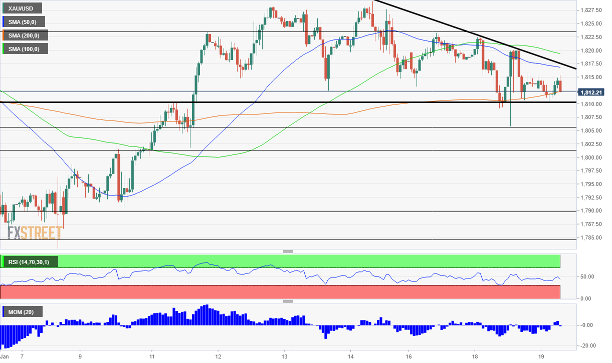 The XAU/USD pair trades at the 1,812.93 price level, holding above the downtrend line originating from the relative highs at 1,876.95. As long as the price remains above the line at the daily close, the bullish breakout should be considered valid and the upward move as the most probable development.