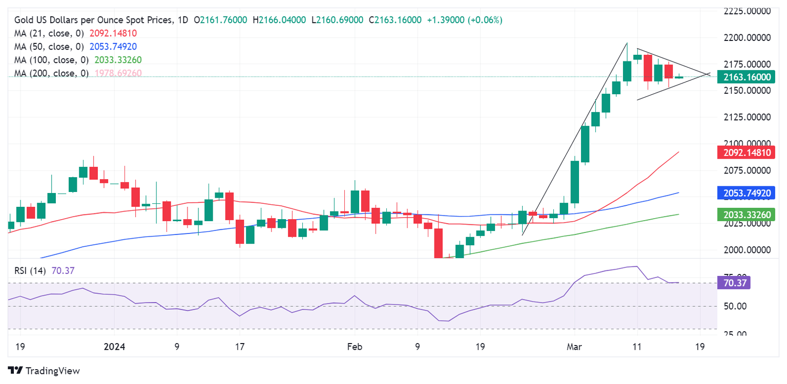 Gold price is consolidating weekly losses near $2,160 early Friday, as risk sentiment remains sour and keeps the US Dollar (USD) underpinned. Gold traders remain wary and refrain from placing fresh positional bets, as the focus shifts to next week’s US Federal Reserve (Fed) monetary policy announcements.