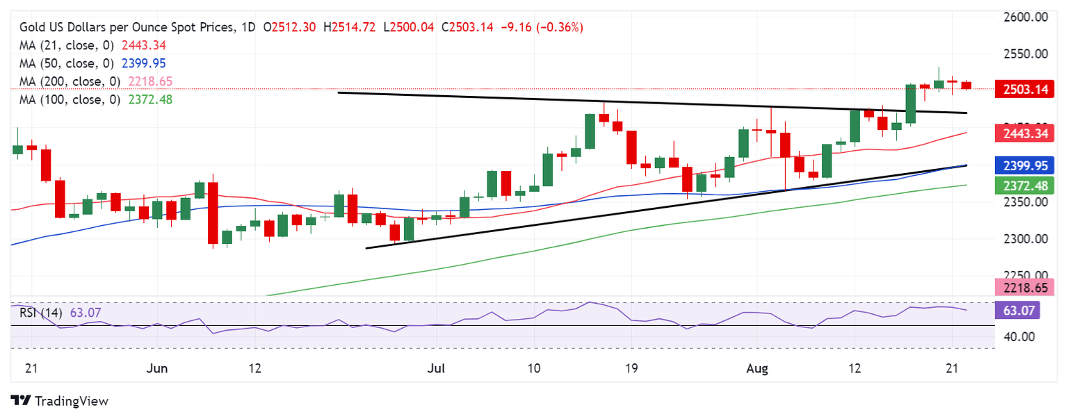Gold price is looking to build on the previous correction in Thursday’s Asian session, challenging the key $2,500 level. Gold traders resort to profit-taking ahead of the top-tier US Preliminary S&P Global business PMI data, which could throw fresh light on the US Federal Reserve (Fed) interest-rate outlook in the countdown to Chair Jerome Powell’s Jackson Hole appearance on Friday.