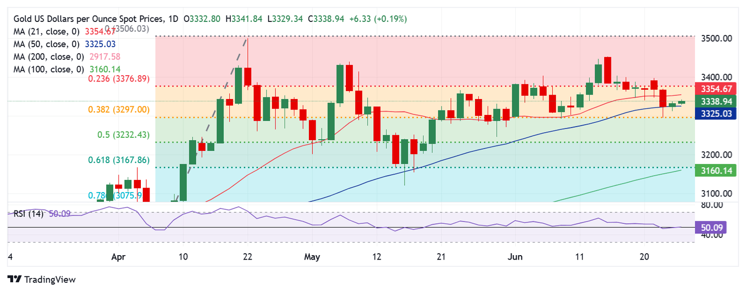 The daily chart shows that Gold price is holding onto the strong support of the 50-day Simple Moving Average (SMA) at $3,325.