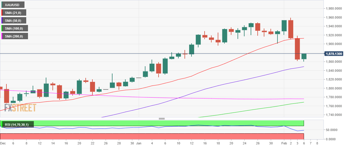 Gold price was smashed to the lowest level in four weeks at $1,860 early Monday, as the Asian traders hit their desks and piled on the United States Dollar (USD) in the wake of Friday’s US employment data for January. The US Dollar jumped alongside the US Treasury bond yields after Nonfarm Payrolls rose 517,000 against expectations of 185,000. The Unemployment Rate in the United States defied forecasts of a rise to 3.6%, falling to 3.4% from 3.5%. Other measures of the US labor market report and the US Institute for Supply Management (ISM) Services PMI also came in strong, bolstering expectations of a higher terminal Federal funds rate, likely above 5.0%. The ISM said on Friday its non-manufacturing PMI increased to 55.2 last month vs. 49.2 reported in December. The ISM survey's gauge of new orders received by services businesses increased to 60.4 in January, while the measure of services industry supplier deliveries rose to 50.0 from 48.5.