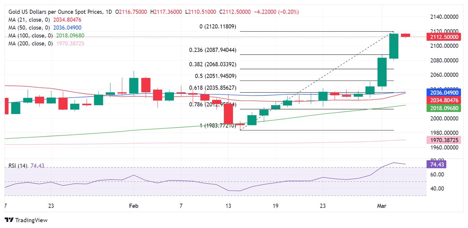 As observed on the daily chart, Gold price is reverting toward the 23.6% Fibonacci Retracement (Fibo) level of the recent rally from the February 14 low of $1,984 to the three-month high of $2,120, aligned at $2,088.
