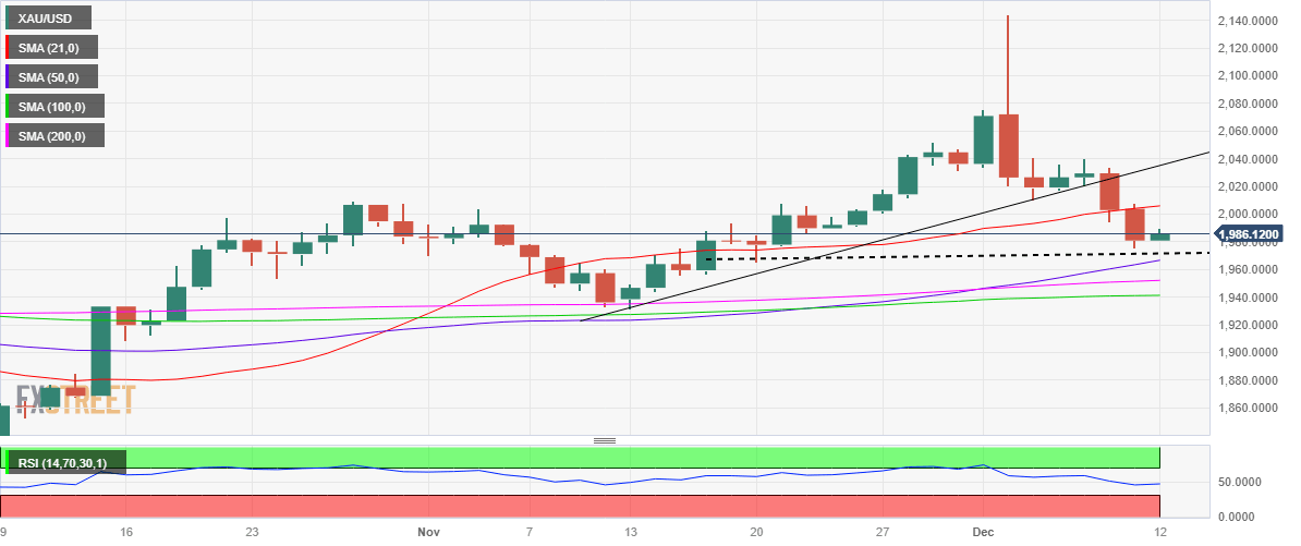 As observed on the daily chart, Gold price closed Monday below the day Simple Moving Average (SMA) at $2,006, following a breakdown from the ascending trendline support of $2,024 on Friday.