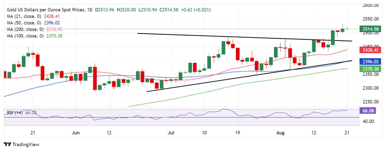 Gold price is on the front foot above $2,510 in Wednesday’s Asian trading, consolidating the previous upsurge to a new all-time high of $2,532. Gold traders take account of broad risk-aversion and refrain from placing fresh bets ahead of the Minutes of the US Federal Reserve (Fed) July meeting due later on Wednesday.
