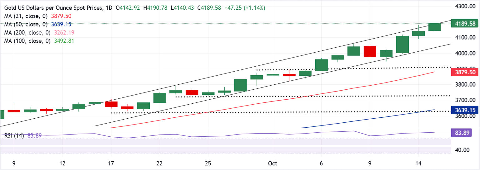 Gold keeps on making higher highs on the daily time frame, sitting close to fresh record highs below $4,200 early Wednesday.