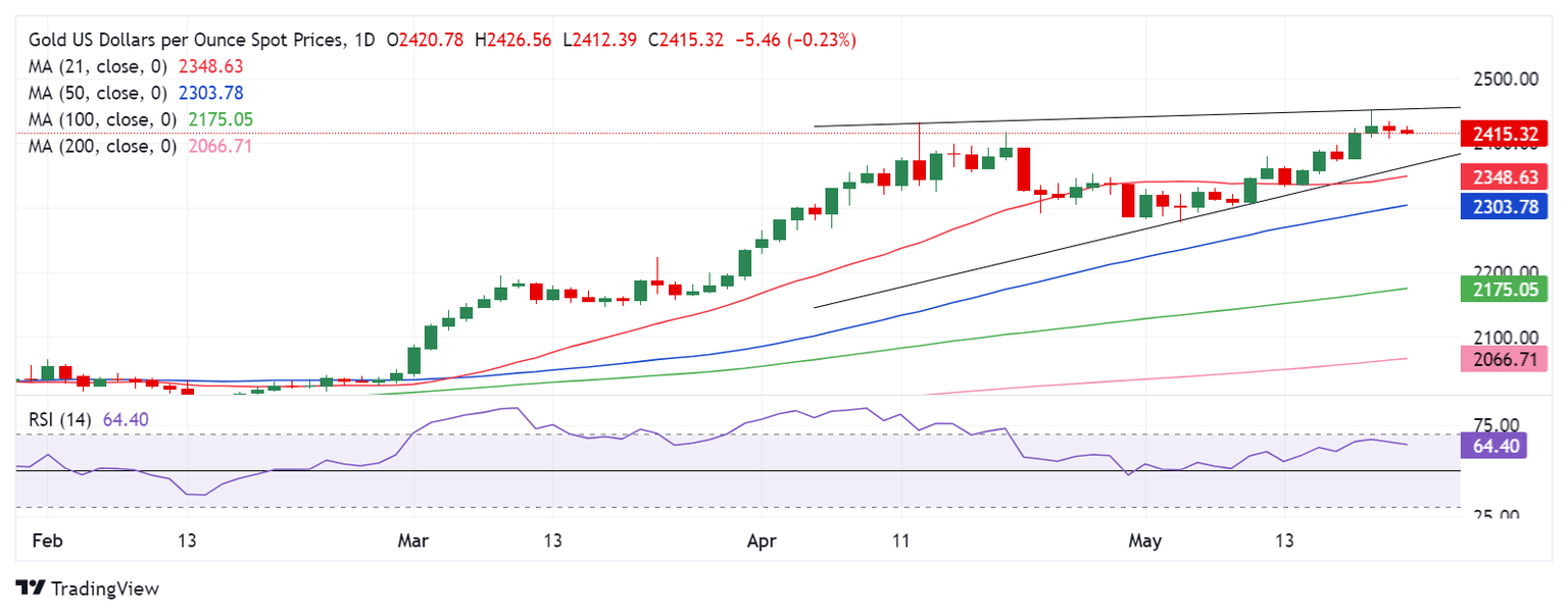 Having kicked off the week on a positive, Gold price retreated from record highs of $2,450, now entering a phase of downside consolidation. Investors assess the implications of the recent cautious stance on inflation and interest rate outlooks, adopted by several Fed officials after April Consumer Price Index (CPI) data from the US fuelled rate cut expectations.