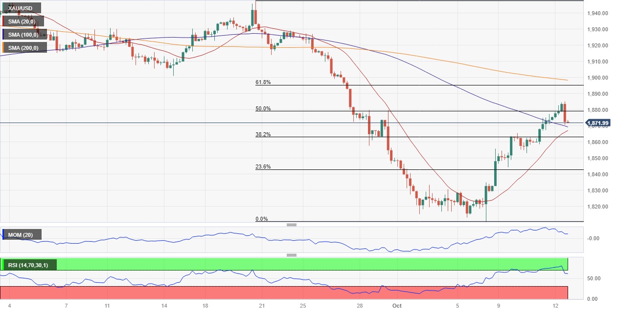 The 4-hour chart shows XAU/USD is currently around a bearish 100 SMA, while the 20 SMA keeps advancing below the current level. The Momentum indicator consolidates within positive levels, while the Relative Strength Index (RSI) indicator corrected overbought conditions, heading south far above its midline. The 38.2% retracement of the aforementioned decline provides immediate support at $1,862.70, with a steeper decline expected on a break below it.